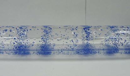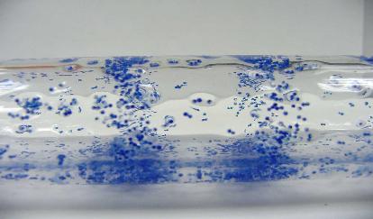 Particles which are initially distributed uniformly in a film rimming a rotating cylinder will be drawn into bands. The fluid used here is a solution of ZnCl2, Triton X100 and water. The rotating speed is 1.1 rpm and the formation of the bands takes hours.