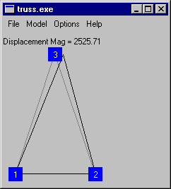 Note the displacement magnification, it is much less than one. A valid solution (assuming the applied forces are physically reasonable) will always have a displacement magnification greater than roughly 10. In addition, the displacement at node 3 in the horizontal direction is in the opposite direction from the applied force. Thus, this solution makes no physical sense. This shows one of the major problems with computer solutions: just because the computer gives you a solution does not mean that it is physically meaningful.