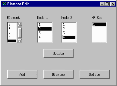 This dialog shows the possible choices of node numbers, one for each end of the element, Node 1 and Node 2, and MPset numbers. Each end of the element must be connected to different nodes and only one element is allowed between each pair of nodes.