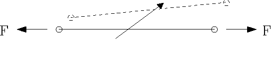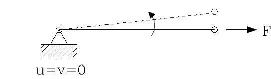 While we can easily solve for the force and stress in this bar, it is free to move as shown (note that under the small displacements assumptions we have made, the fact that the force is no longer directly along the bar in the dashed configuration is ignored) and the displacements can be changed arbitarily by this rigid translation and rotation. Because rigid translations and rotations produce no strains, they do not change the stresses or forces. And since we have only specified forces in the boundary conditions, we still have a solution to our problem after the addition of arbitrary displacements.
