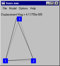 Note the displacement magnification, it is much less than one. A valid solution (assuming the applied forces are physically reasonable) will always have a displacement magnification greater than roughly 10. In addition, the displacement at node 3 in the horizontal direction is in the opposite direction from the applied force. Thus, this solution makes no physical sense. This shows one of the major problems with computer solutions: just because the computer gives you a solution does not mean that it is physically meaningful.