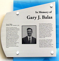 On April 24, 2015, the Department of Aerospace Engineering and Mechanics held a dedication ceremony for the Akerman Hangar, renaming it the Gary J. Balas Atrium.