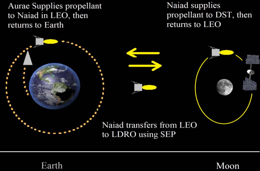 "CLETUS also offers room for growth. By verifying that low-thrust trajectories are possible between the Earth and Moon with large payloads, similar vehicles to Naiad could be developed to supply the Deep Space Gateway or any future lunar operations; even interplanetary missions. Propellant transfer at the scale needed for CLETUS can be applied to other missions and at any scaling. An obvious application of the system would be for propellant depots. At present, a primary risk in the system is if the Aurae missions are delayed, which could mean that the DST cannot be supplied for that opportunity. A depot in LEO, GEO, or in Cis-Lunar space could make Naiad or DST missions independent of Earth launch capabilities (assuming Aurae is delayed). Depots could use the LAD technology for propellant transfer to supply any visiting spacecraft. Aurae spacecraft, or vehicles derived from it, could be used to supply depots and other spacecraft and act as a servicing craft for other missions."