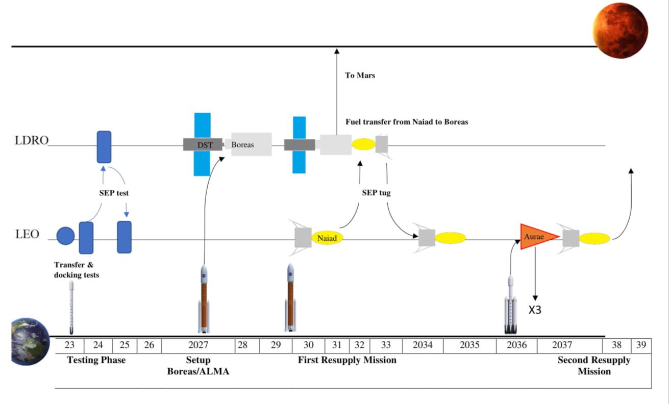 "The multiple components of the CLETUS architecture work together to successfully resupply the Deep Space Transport and Columbia University’s ALMA hybrid propulsion system. The Aurae will ferry propellant from Earth to the Naiad, which will in turn use a low-thrust spiral trajectory to rendezvous with the Boreas tank attached to ALMA and the DST. 36 metric tons of NTO/MMH and 44 tons of liquid argon will be delivered to Boreas each rendezvous. Naiad then returns to Earth orbit to repeat the process so as to resupply the DST every other Mars mission opportunity, or every five years."